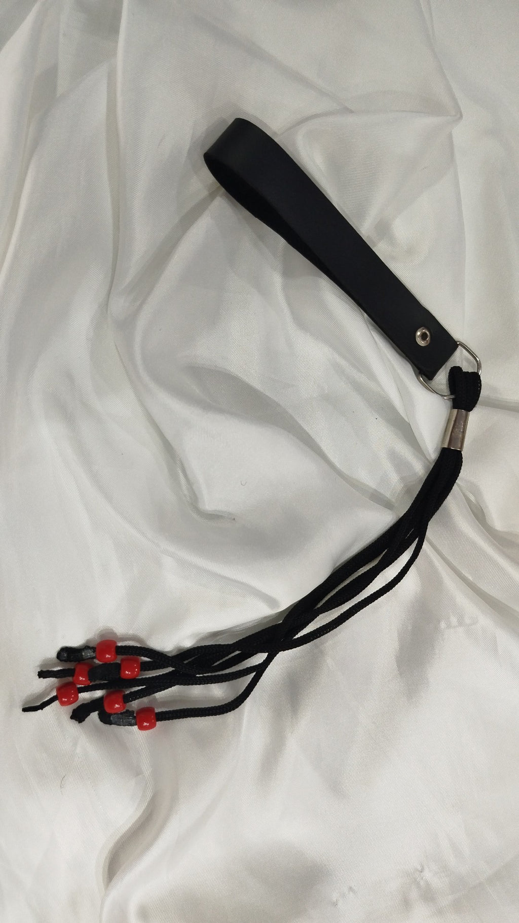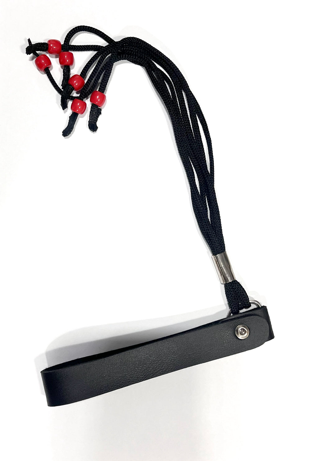 Com design elegante e firme, o chicote possui alça em couro sintético resistente, proporcionando pegada segura e confortável. Suas tiras em cordão preto com detalhes em contas vermelhas adicionam um toque de sensualidade e estilo ao momento.