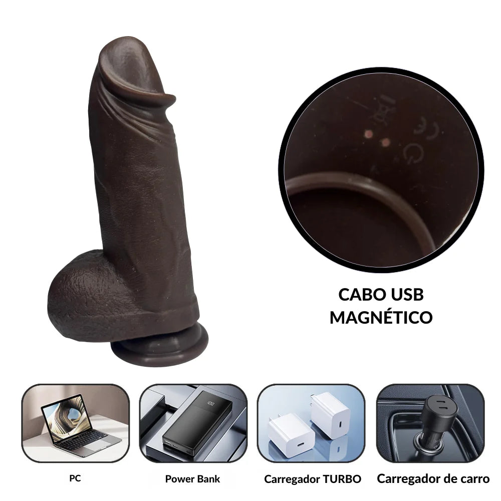 Prótese peniana realística com glande, dupla camada de silicone, veias reais, escroto e ventosa, acompanha controle remoto. Possui função de aquecimento para imitar a temperatura corporal, proporcionando uma experiência mais realista.